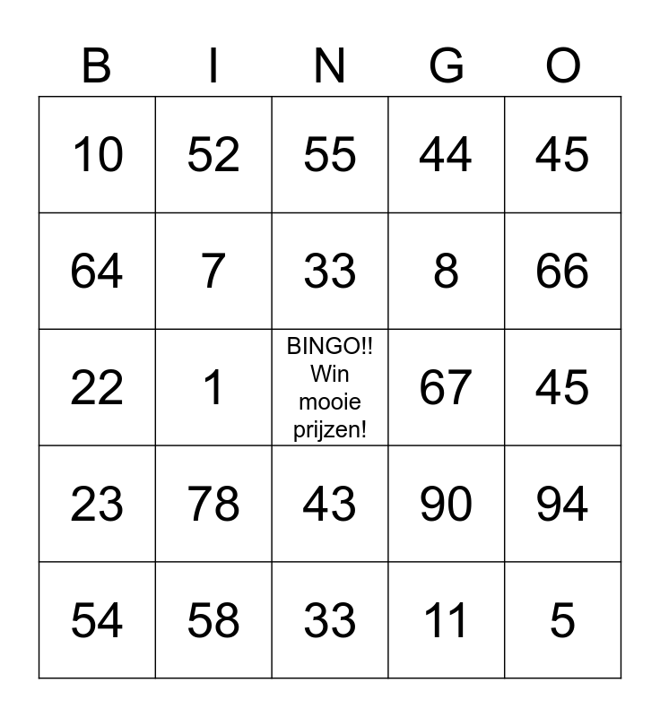 This bingo card has a free space and 24 words: 78, 58, 33, 54, 45, 10, 64, 52, 67, 43, 8, 22, 90, 94, 7, 11, 45, 55, 66, 1, 5, 23, 44 and 33.