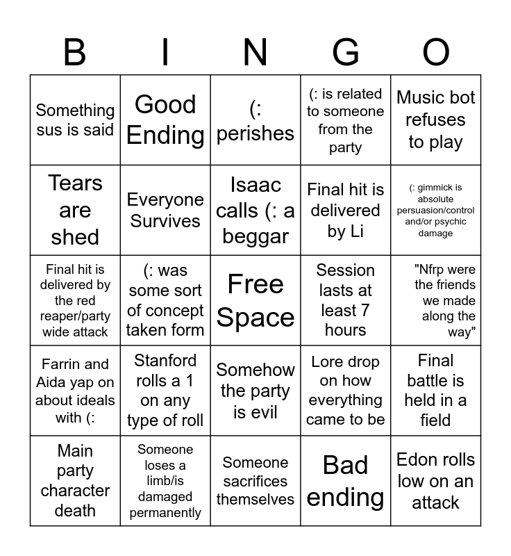 This bingo card has a free space and 24 words: Main party character death, Stanford rolls a 1 on any type of roll, Isaac calls (: a beggar, Bad ending, Music bot refuses to play, Something sus is said, Good Ending, (: perishes, Session lasts at least 7 hours, "Nfrp were the friends we made along the way", Final hit is delivered by the red reaper/party wide attack, Everyone Survives, Lore drop on how everything came to be, Final battle is held in a field, Tears are shed, Someone loses a limb/is damaged permanently, Someone sacrifices themselves, (: is related to someone from the party, (: gimmick is absolute persuasion/control and/or psychic damage, Farrin and Aida yap on about ideals with (:, (: was some sort of concept taken form, Somehow the party is evil, Final hit is delivered by Li and Edon rolls low on an attack.