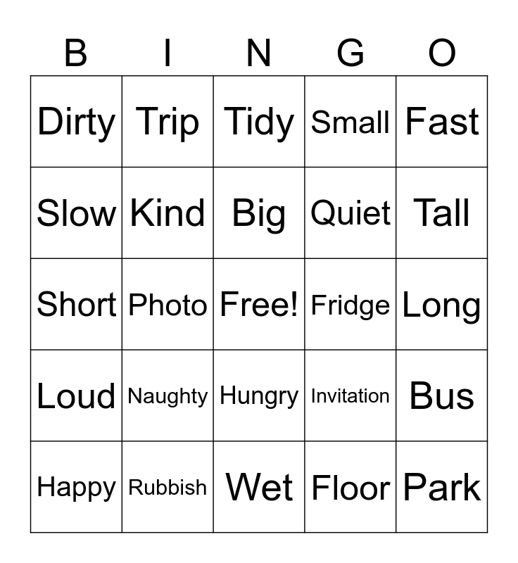 This bingo card has a free space and 29 words: Happy, Sad, Photo, Untidy, Dirty, Tidy, Kind, Naughty, Fridge, Rubbish, Long, Park, Wet, Floor, Tall, Dry, Hungry, Loud, Fast, Short, Invitation, Wash, Quiet, Slow, Small, Trip, Bus, Big and Cold.