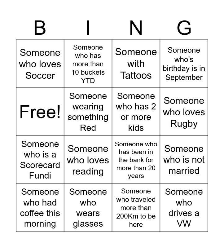 This bingo card has 16 words: Someone who wears glasses, Someone who is not married, Someone with Tattoos, Someone who loves Soccer, Someone who is a Scorecard Fundi, Someone who has more than 10 buckets YTD, Someone who has been in the bank for more than 20 years, Someone who traveled more than 200Km to be here, Free!, Someone wearing something Red, Someone who had coffee this morning, Someone who's birthday is in September, Someone who loves reading, Someone who loves Rugby, Someone who has 2 or more kids and Someone who drives a VW.