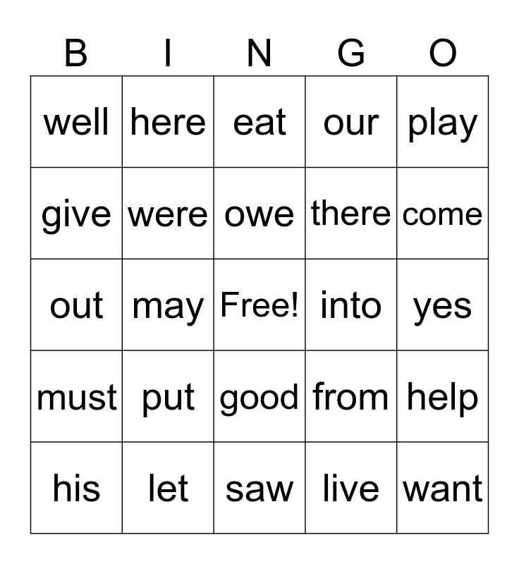This bingo card has a free space and 29 words: his, be, may, get, well, eat, were, put, into, let, yes, want, saw, live, come, out, good, must, play, out, from, make, there, give, our, here, help, owe and Free!.