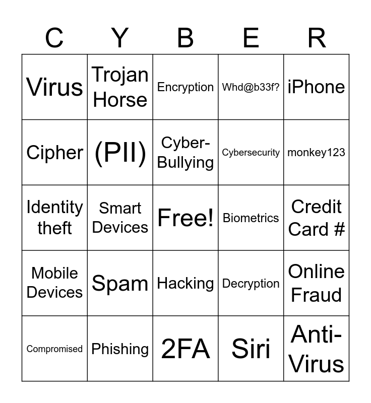 This bingo card has a free space and 24 words: Compromised, Spam, Cyber- Bullying, Siri, iPhone, Virus, Trojan Horse, Encryption, Biometrics, Credit Card #, Identity theft, (PII), Decryption, Online Fraud, Cipher, Phishing, 2FA, Whd@b33f?, monkey123, Mobile Devices, Smart Devices, Hacking, Cybersecurity and Anti-Virus.