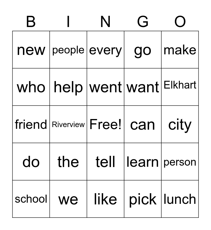 This bingo card has a free space and 24 words: the, we, went, school, make, new, who, people, can, tell, want, friend, learn, person, help, pick, city, every, Elkhart, Riverview, lunch, do, go and like.