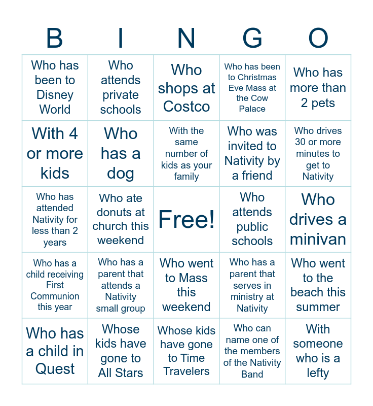 This bingo card has a free space and 24 words: Who has a parent that attends a Nativity small group, Whose kids have gone to All Stars, With the same number of kids as your family, Who has a child in Quest, Who has more than 2 pets, Who has been to Disney World, With 4 or more kids, Who attends private schools, Who attends public schools, Who went to Mass this weekend, Who was invited to Nativity by a friend, Who has attended Nativity for less than 2 years, Who has a parent that serves in ministry at Nativity, Who went to the beach this summer, Who has a dog, Who can name one of the members of the Nativity Band, Who drives a minivan, Who shops at Costco, Who drives 30 or more minutes to get to Nativity, Who ate donuts at church this weekend, With someone who is a lefty, Who has a child receiving First Communion this year, Who has been to Christmas Eve Mass at the Cow Palace and Whose kids have gone to Time Travelers.