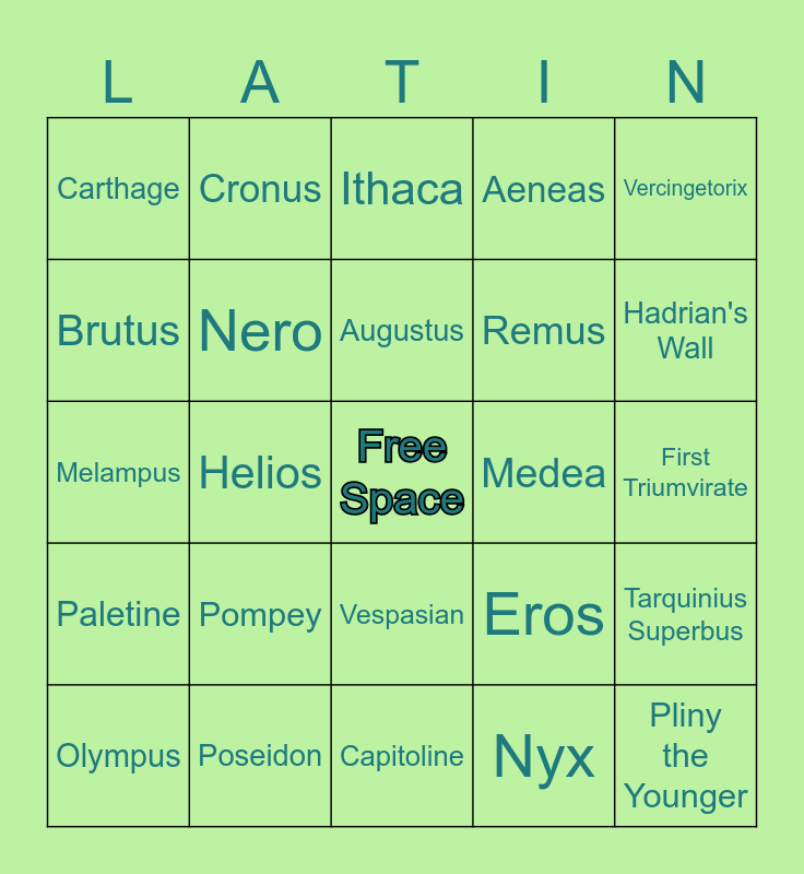 This bingo card has a free space and 59 words: Zeus, Poseidon, Forum, Paletine, Nyx, Phaeton, Nero, Numa Pompilius, Remus, Ogygia, Aeneas, Venus, Brutus, Cato the Elder, Hannibal, Carthage, Pliny the Younger, Vercingetorix, Julius Caesar, Augustus, Medea, Ithaca, Olympus, Tarquinius Superbus, Romulus, Servius Tullius, Rhea Silvia, Mars, Hadrian's Wall, Caligula, Tiberius, Styx, Lethe, Atlas, Cronus, Minerva, Eos, Helios, Circe, Melampus, Chimera, Pompey, First Triumvirate, Second Triumvirate, Pollux, Europa, Dionysus, Cicero, Vespasian, Capitoline, Diocletian, Telemachus, Gaea, Pluto, Proserpine, Eros, Mark Antony, Elagabalus and Constantine.