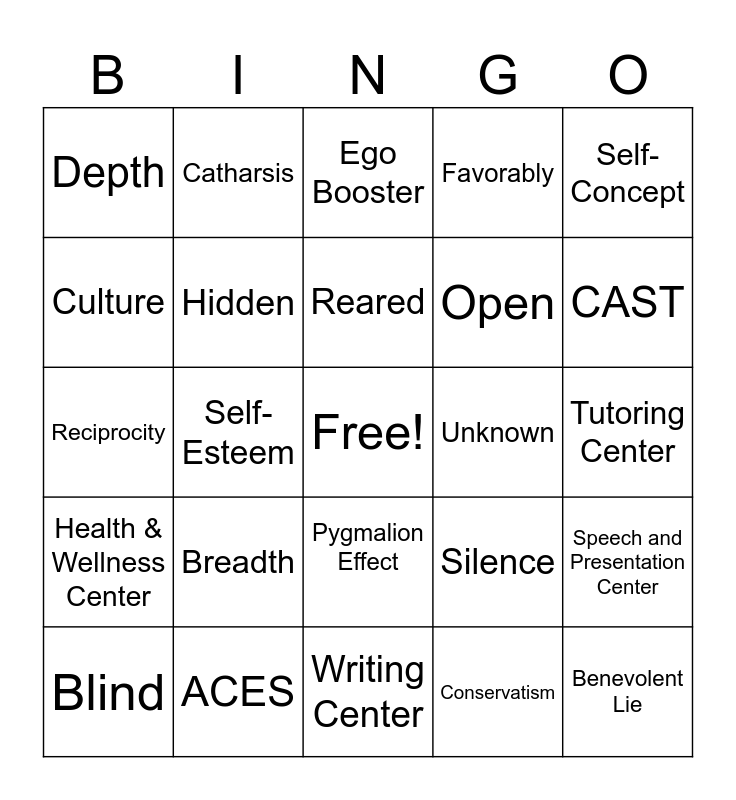This bingo card has a free space and 24 words: Breadth, ACES, Reared, Blind, Self-Concept, Depth, Culture, Catharsis, Unknown, Pygmalion Effect, Open, Reciprocity, Silence, Speech and Presentation Center, Hidden, Conservatism, Tutoring Center, Ego Booster, CAST, Self-Esteem, Benevolent Lie, Health & Wellness Center, Favorably and Writing Center.