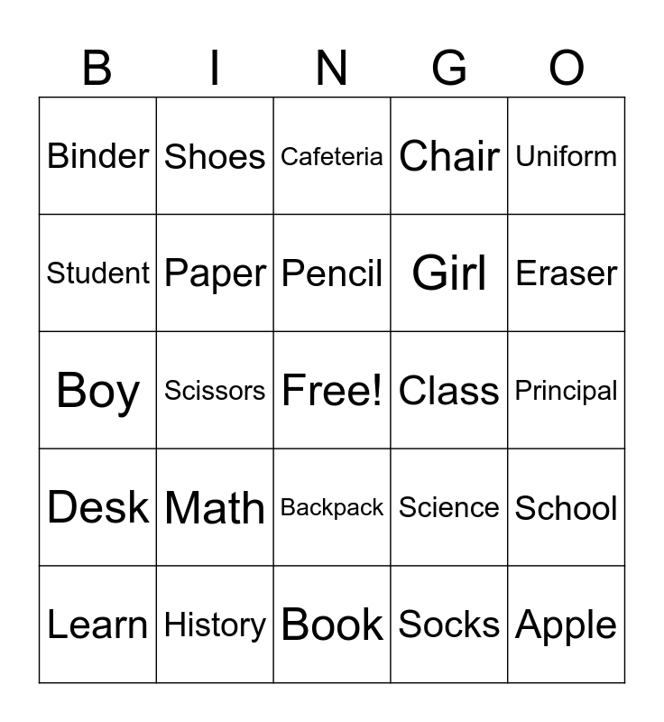 This bingo card has a free space and 24 words: Math, History, Pencil, Learn, Uniform, Binder, Student, Shoes, Class, Backpack, Girl, Boy, Science, School, Paper, Socks, Principal, Cafeteria, Eraser, Scissors, Apple, Desk, Chair and Book.