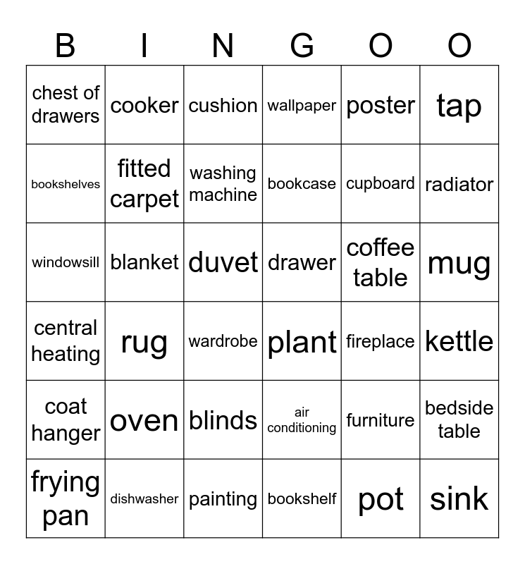 This bingo card has 36 words: air conditioning, blinds, bookshelf, bookshelves, central heating, drawer, fitted carpet, painting, poster, furniture, radiator, wallpaper, bedside table, blanket, bookcase, chest of drawers, coat hanger, coffee table, windowsill, cushion, duvet, rug, plant, wardrobe, fireplace, cooker, cupboard, dishwasher, washing machine, tap, sink, frying pan, kettle, mug, oven and pot.