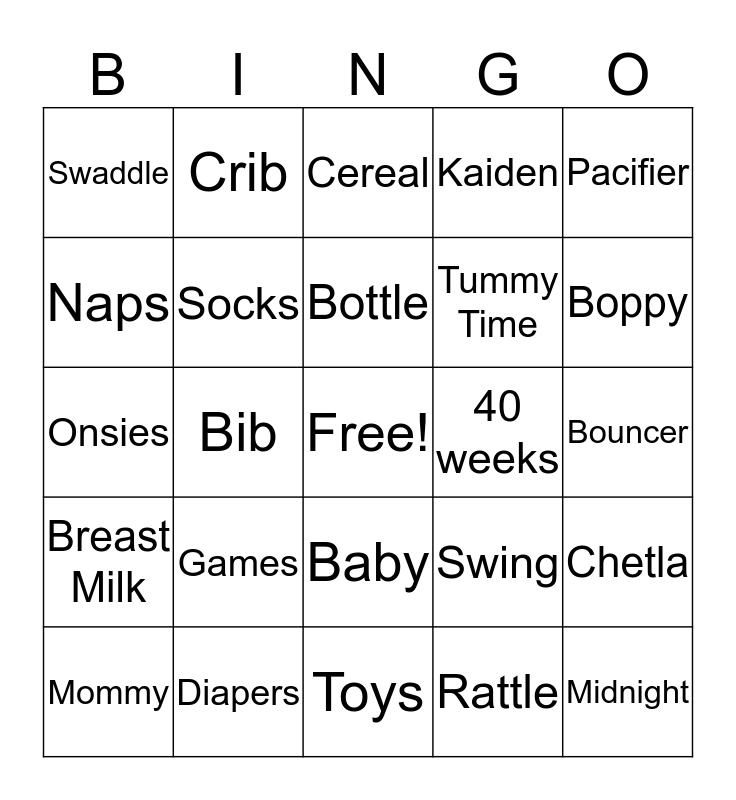 This bingo card has a free space and 26 words: Baby, Rattle, Bottle, Diapers, Pacifier, Swaddle, Naps, Crib, Bouncer, Swing, Tummy Time, Onsies, Chetla, Mommy, Bib, Big Bro, Kaiden, Breast Milk, Cereal, Midnight, Boppy, Toys, 40 weeks, Games, Socks and Burp Cloth.