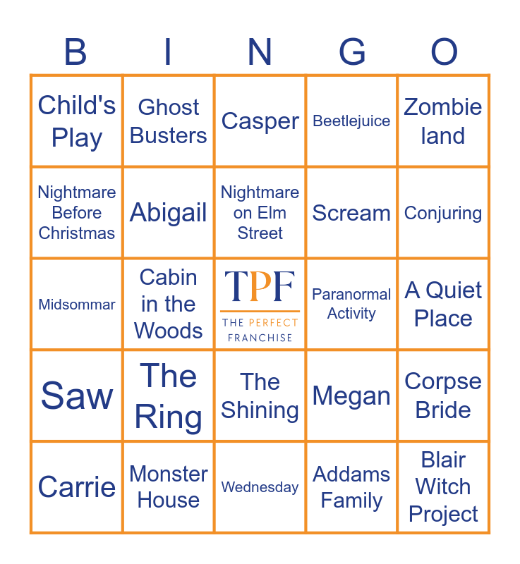 This bingo card has a free space and 28 words: Corpse Bride, IT, Scream, Addams Family, Nightmare Before Christmas, Casper, Ghost Busters, Saw, Paranormal Activity, Carrie, Midsommar, Beetlejuice, Monster House, Wednesday, Conjuring, Coraline, The Ring, Abigail, Nightmare on Elm Street, The Shining, Child's Play, Get Out, Blair Witch Project, Cabin in the Woods, A Quiet Place, Megan, Zombie land and The Sixth Sense.