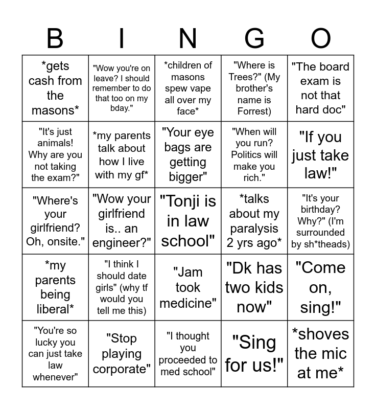 This bingo card has a free space and 26 words: "Jam took medicine", "Sing for us!", "Your eye bags are getting bigger", "Stop playing corporate", "The board exam is not that hard doc", *gets cash from the masons*, "It's just animals! Why are you not taking the exam?", "Wow you're on leave? I should remember to do that too on my bday.", "It's your birthday? Why?" (I'm surrounded by sh*theads), "Dk has two kids now", "When will you run? Politics will make you rich.", "Where's your girlfriend? Oh, onsite.", "Come on, sing!", "You're so lucky you can just take law whenever", "Wow your girlfriend is.. an engineer?", *mentions the burglary at our home for the nth time*, "Where is Trees?" (My brother's name is Forrest), *my parents being liberal*, *children of masons spew vape all over my face*, *shoves the mic at me*, "If you just take law!", "I thought you proceeded to med school", *talks about my paralysis 2 yrs ago*, "I think I should date girls" (why tf would you tell me this), *my parents talk about how I live with my gf* and "I thought you were reviewing for board exams.