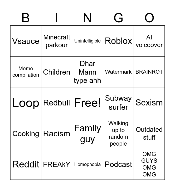 This bingo card has a free space and 24 words: Racism, FREAkY, Dhar Mann type ahh, Reddit, AI voiceover, Vsauce, Meme compilation, Minecraft parkour, Subway surfer, Family guy, Watermark, Loop, Walking up to random people, Outdated stuff, Children, Podcast, Sexism, Unintelligible, BRAINROT, Redbull, OMG GUYS OMG OMG, Cooking, Roblox and Homophobia.