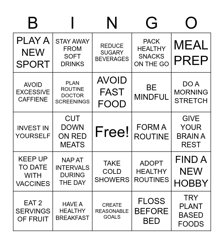 This bingo card has a free space and 24 words: NAP AT INTERVALS DURING THE DAY, HAVE A HEALTHY BREAKFAST, AVOID FAST FOOD, EAT 2 SERVINGS OF FRUIT, MEAL PREP, PLAY A NEW SPORT, AVOID EXCESSIVE CAFFIENE, STAY AWAY FROM SOFT DRINKS, FORM A ROUTINE, TAKE COLD SHOWERS, BE MINDFUL, INVEST IN YOURSELF, ADOPT HEALTHY ROUTINES, FIND A NEW HOBBY, PLAN ROUTINE DOCTOR SCREENINGS, FLOSS BEFORE BED, GIVE YOUR BRAIN A REST, REDUCE SUGARY BEVERAGES, DO A MORNING STRETCH, CUT DOWN ON RED MEATS, TRY PLANT BASED FOODS, KEEP UP TO DATE WITH VACCINES, PACK HEALTHY SNACKS ON THE GO and CREATE REASONABLE GOALS.