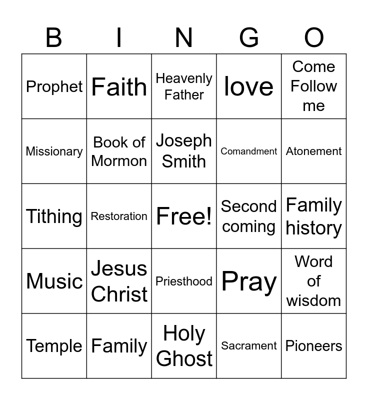 This bingo card has a free space and 25 words: Jesus Christ, Holy Ghost, Joseph Smith, Temple, Come Follow me, Prophet, Missionary, Faith, Second coming, Priesthood, Comandment, Tithing, Pray, Word of wisdom, Book of Mormon, Doctorine and covenants, Family history, Heavenly Father, Atonement, Restoration, Pioneers, Family, Music, love and Sacrament.