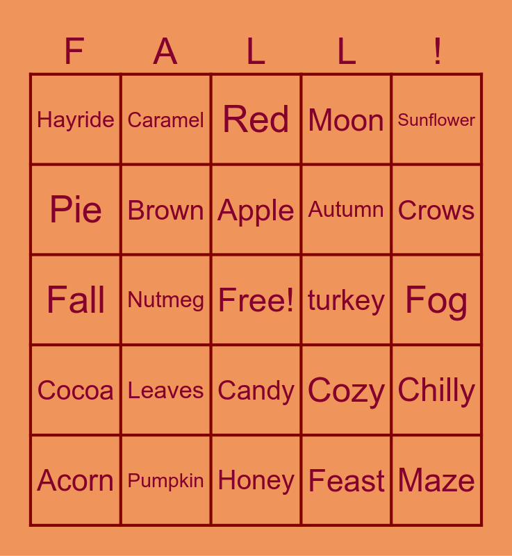 This bingo card has a free space and 24 words: Leaves, Pumpkin, Apple, Acorn, Sunflower, Hayride, Pie, Caramel, turkey, Candy, Autumn, Fall, Cozy, Chilly, Brown, Feast, Fog, Red, Crows, Nutmeg, Maze, Cocoa, Moon and Honey.