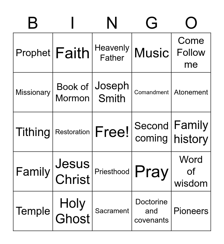 This bingo card has a free space and 24 words: Jesus Christ, Holy Ghost, Joseph Smith, Temple, Come Follow me, Prophet, Missionary, Faith, Second coming, Priesthood, Comandment, Tithing, Pray, Word of wisdom, Book of Mormon, Doctorine and covenants, Family history, Heavenly Father, Atonement, Restoration, Pioneers, Family, Music and Sacrament.