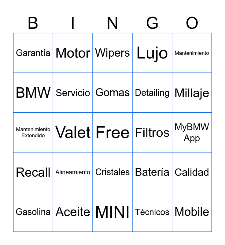 This bingo card has a free space and 24 words: Alineamiento, Aceite, Gomas, Gasolina, Mantenimiento, Garantía, BMW, Motor, Filtros, Cristales, Detailing, Mantenimiento Extendido, Batería, Calidad, Servicio, Técnicos, MyBMW App, Wipers, Millaje, Valet, Mobile, Recall, Lujo and MINI.