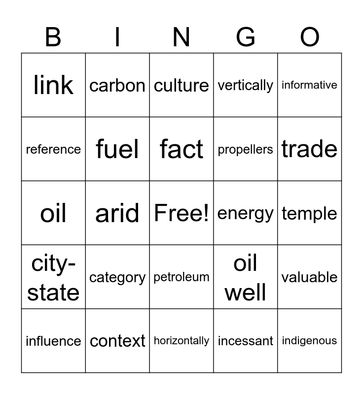 This bingo card has a free space and 24 words: category, context, fact, influence, informative, link, reference, carbon, energy, petroleum, propellers, oil, oil well, valuable, fuel, incessant, temple, culture, trade, arid, indigenous, city-state, vertically and horizontally.