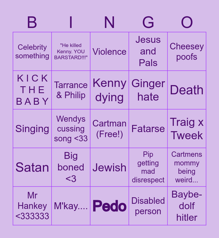 This bingo card has a free space and 24 words: Big boned <3, M'kay...., Kenny dying, Mr Hankey <333333, Cheesey poofs, Celebrity something, K I C K T H E B A B Y, "He killed Kenny. YOU BARSTARD!!!", Fatarse, Jewish, Ginger hate, Singing, Pip getting mad disrespect, Cartmens mommy being weird..., Tarrance & Philip, Disabled person, Traig x Tweek, Violence, Death, Wendys cussing song <33, Baybe-dolf hitler, Satan, Jesus and Pals and Pedo.