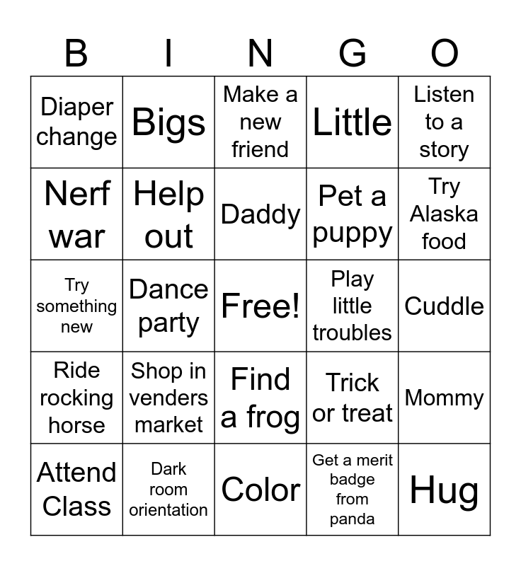 This bingo card has a free space and 29 words: Attend Class, Spirit of CAPcon, Dance party, Bottle, Diaper change, Make a new friend, Help out, Shop in venders market, Play little troubles, Dark room orientation, Cuddle, Hug, Color, Get a merit badge from panda, Try Alaska food, Use sippy, Find a frog, Ride rocking horse, Listen to a story, Try something new, Trick or treat, Watch a movie, Pet a puppy, Nerf war, Little, Bigs, Mommy, Daddy and Kiss.