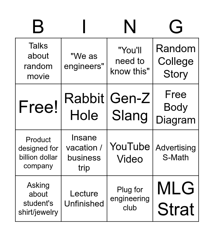 This bingo card has 16 words: Lecture Unfinished, Advertising S-Math, "You'll need to know this", Talks about random movie, Product designed for billion dollar company, "We as engineers", YouTube Video, Plug for engineering club, Free!, Rabbit Hole, Asking about student's shirt/jewelry, Random College Story, Insane vacation / business trip, Free Body Diagram, Gen-Z Slang and MLG Strat.
