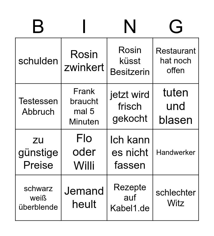 This bingo card has 16 words: Jemand heult, Handwerker, Rosin küsst Besitzerin, schulden, zu günstige Preise, Rosin zwinkert, Ich kann es nicht fassen, Rezepte auf Kabel1.de, Testessen Abbruch, Frank braucht mal 5 Minuten, schwarz weiß überblende, Restaurant hat noch offen, Flo oder Willi, tuten und blasen, jetzt wird frisch gekocht and schlechter Witz.