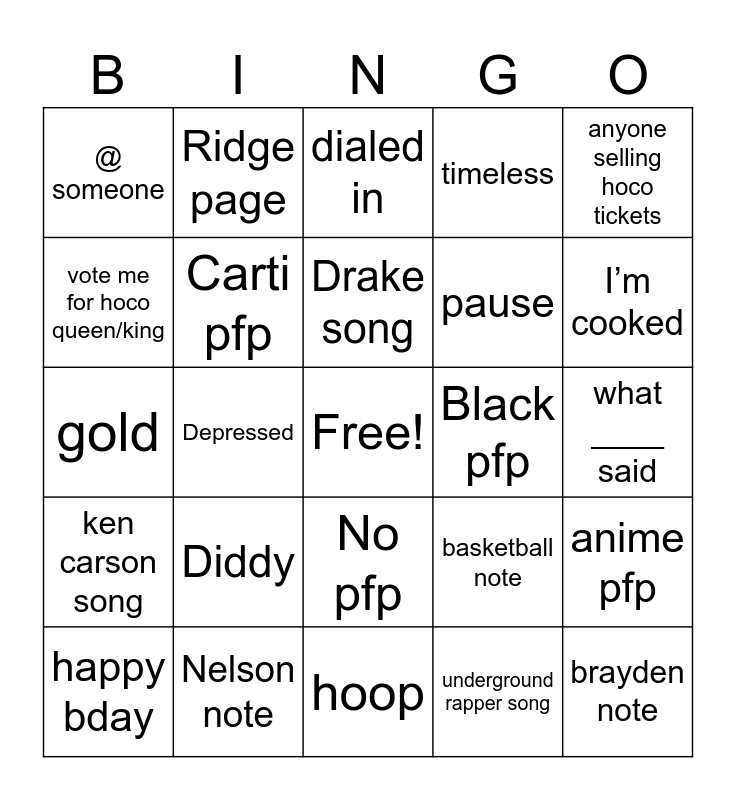 This bingo card has a free space and 24 words: Diddy, Nelson note, Drake song, happy bday, anyone selling hoco tickets, @ someone, vote me for hoco queen/king, Ridge page, Black pfp, No pfp, pause, gold, basketball note, anime pfp, Carti pfp, underground rapper song, what ____ said, dialed in, I’m cooked, Depressed, brayden note, ken carson song, timeless and hoop.