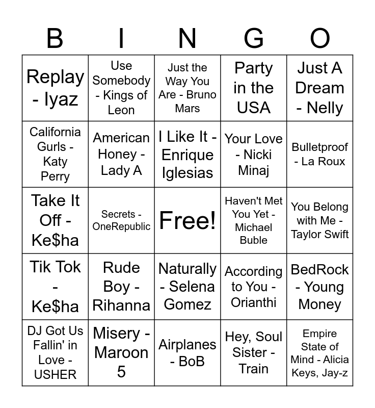 This bingo card has a free space and 30 words: Misery - Maroon 5, Teenage Dream - Katy Perry, Secrets - OneRepublic, The Only Exception - Paramore, Replay - Iyaz, Just the Way You Are - Bruno Mars, American Honey - Lady A, Naturally - Selena Gomez, Haven't Met You Yet - Michael Buble, Airplanes - BoB, You Belong with Me - Taylor Swift, Empire State of Mind - Alicia Keys, Jay-z, Hey, Soul Sister - Train, Mine - Taylor Swift, Bulletproof - La Roux, Life After You - Daughtry, According to You - Orianthi, Tik Tok - Ke$ha, Rude Boy - Rihanna, Just A Dream - Nelly, Take It Off - Ke$ha, Telephone - Lady Gaga, Beyonce, Use Somebody - Kings of Leon, Your Love - Nicki Minaj, California Gurls - Katy Perry, Party in the USA, BedRock - Young Money, DJ Got Us Fallin' in Love - USHER, I Like It - Enrique Iglesias and Dynamite - Taio Cruz.