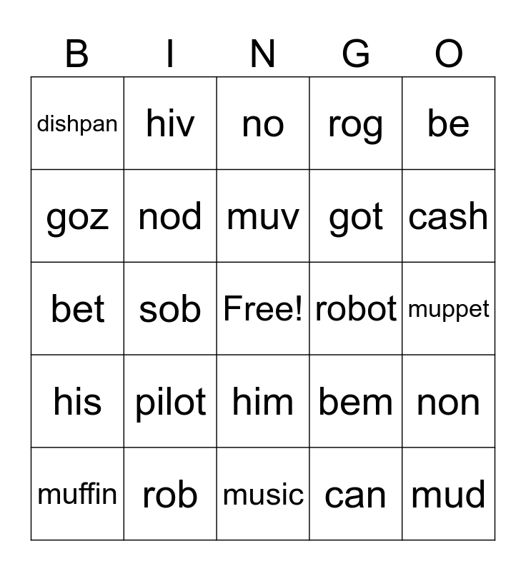 This bingo card has a free space and 29 words: muffin, so, sob, suntan, dishpan, no, nod, pilot, robot, rob, muppet, mud, music, can, cash, hi, him, his, be, bet, bem, go, got, goz, rog, hiv, non, muv and fo.