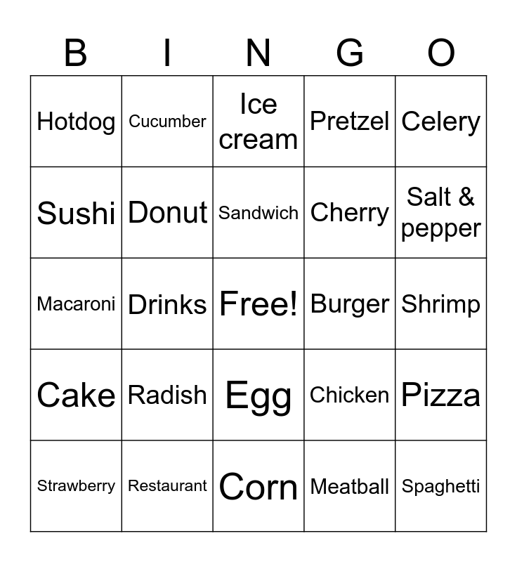 This bingo card has a free space and 30 words: Restaurant, Steak, Drinks, Fish, Hotdog, Ice cream, Donut, Egg, Burger, Corn, Shrimp, Spaghetti, Meatball, Cheese, Salt & pepper, Tomato, Chicken, Cake, Radish, Celery, Macaroni, Pancake, Cucumber, Cherry, Sushi, Pretzel, Pizza, Strawberry, Sandwich and Bacon.