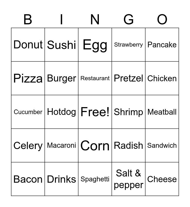 This bingo card has a free space and 30 words: Drinks, Fish, Hotdog, Ice cream, Donut, Egg, Burger, Corn, Shrimp, Spaghetti, Meatball, Cheese, Salt & pepper, Tomato, Chicken, Cake, Radish, Celery, Macaroni, Pancake, Cucumber, Cherry, Sushi, Pretzel, Pizza, Strawberry, Sandwich, Bacon, Restaurant and Steak.