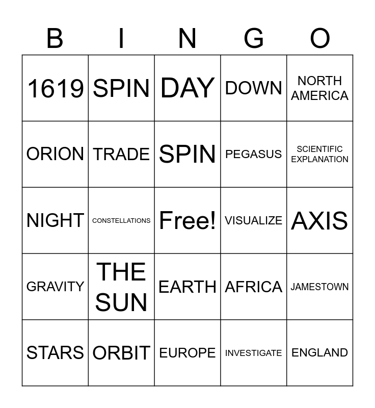 This bingo card has a free space and 24 words: THE SUN, ORBIT, SPIN, STARS, NORTH AMERICA, 1619, ORION, SPIN, VISUALIZE, EARTH, PEGASUS, NIGHT, AFRICA, JAMESTOWN, TRADE, INVESTIGATE, AXIS, DAY, SCIENTIFIC EXPLANATION, CONSTELLATIONS, ENGLAND, GRAVITY, DOWN and EUROPE.