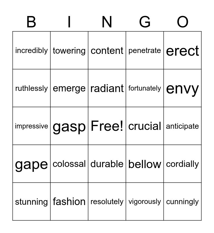 This bingo card has a free space and 24 words: colossal, fashion, radiant, stunning, erect, incredibly, ruthlessly, towering, crucial, durable, fortunately, impressive, bellow, cordially, emerge, vigorously, anticipate, content, envy, gasp, cunningly, gape, penetrate and resolutely.