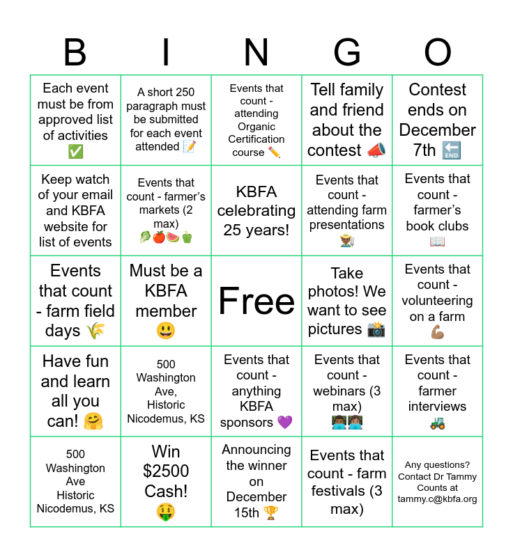 This bingo card has a free space and 24 words: 500 Washington Ave, Historic Nicodemus, KS, Win $2500 Cash! π€, KBFA celebrating 25 years!, 500 Washington Ave Historic Nicodemus, KS, Contest ends on December 7th π, Each event must be from approved list of activities β , Keep watch of your email and KBFA website for list of events, A short 250 paragraph must be submitted for each event attended π, Take photos! We want to see pictures πΈ, Events that count - anything KBFA sponsors π, Events that count - attending farm presentations π¨πΎβπΎ, Events that count - farm field days πΎ, Events that count - webinars (3 max) π¨πΎβπ»π©π½βπ», Events that count - farmer interviews π, Events that count - farmerβs markets (2 max) π₯¬πππ«, Events that count - farm festivals (3 max), Events that count - volunteering on a farm πͺπ½, Events that count - attending Organic Certification course βοΈ, Events that count - farmerβs book clubs π, Must be a KBFA member π, Any questions? Contact Dr Tammy Counts at tammy.c@kbfa.org, Have fun and learn all you can! π€, Tell family and friend about the contest π£ and Announcing the winner on December 15th π.