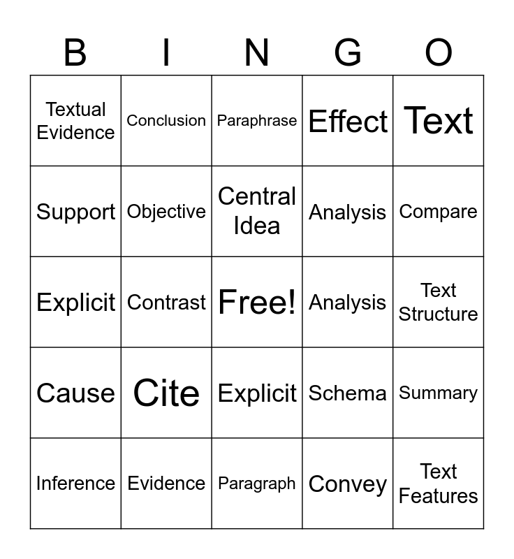 This bingo card has a free space and 24 words: Cite, Evidence, Central Idea, Inference, Text, Textual Evidence, Support, Conclusion, Analysis, Explicit, Analysis, Explicit, Schema, Summary, Objective, Convey, Text Structure, Paraphrase, Compare, Contrast, Text Features, Cause, Effect and Paragraph.