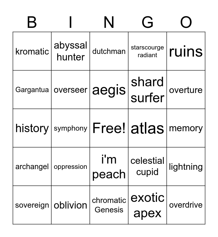 This bingo card has a free space and 24 words: oppression, oblivion, aegis, sovereign, ruins, kromatic, Gargantua, abyssal hunter, atlas, i'm peach, shard surfer, history, celestial cupid, lightning, overseer, exotic apex, memory, dutchman, overture, symphony, overdrive, archangel, starscourge radiant and chromatic Genesis.