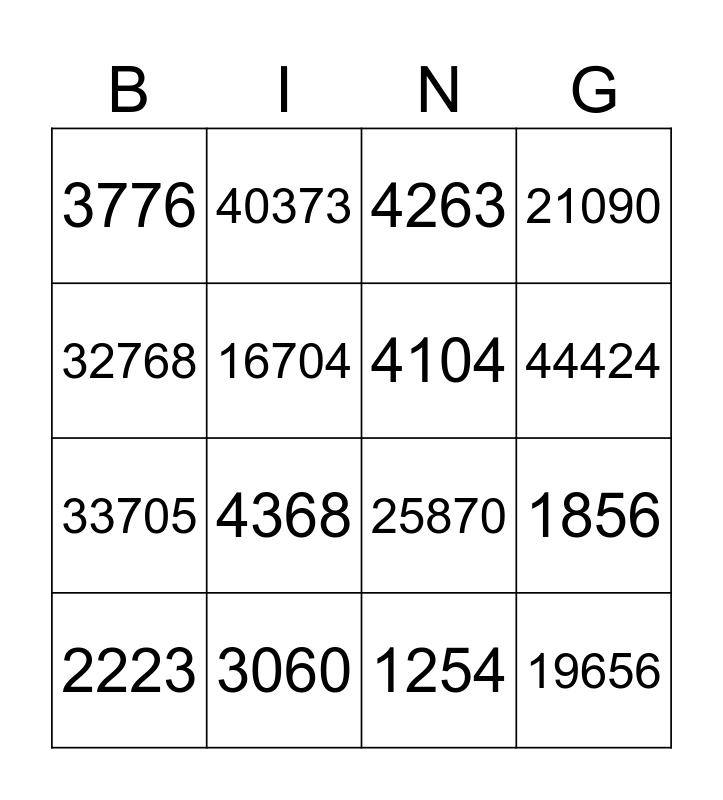 This bingo card has 31 words: Free!, 1175, 1856, 943, 3776, 4263, 4104, 3036, 3060, 2072, 1254, 2223, 2262, 2016, 4368, 3266, 6204, 16524, 19656, 36675, 32768, 36192, 59778, 40373, 33705, 16704, 21090, 25870, 49068, 44424 and 41817.