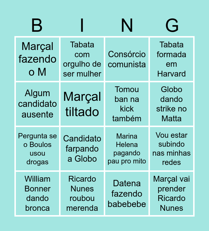 This bingo card has 16 words: Ricardo Nunes roubou merenda, Vou estar subindo nas minhas redes, Consórcio comunista, Marçal fazendo o M, Pergunta se o Boulos usou drogas, Tabata com orgulho de ser mulher, Marina Helena pagando pau pro mito, Datena fazendo babebebe, Algum candidato ausente, Marçal tiltado, William Bonner dando bronca, Tabata formada em Harvard, Candidato farpando a Globo, Globo dando strike no Matta, Tomou ban na kick também and Marçal vai prender Ricardo Nunes.
