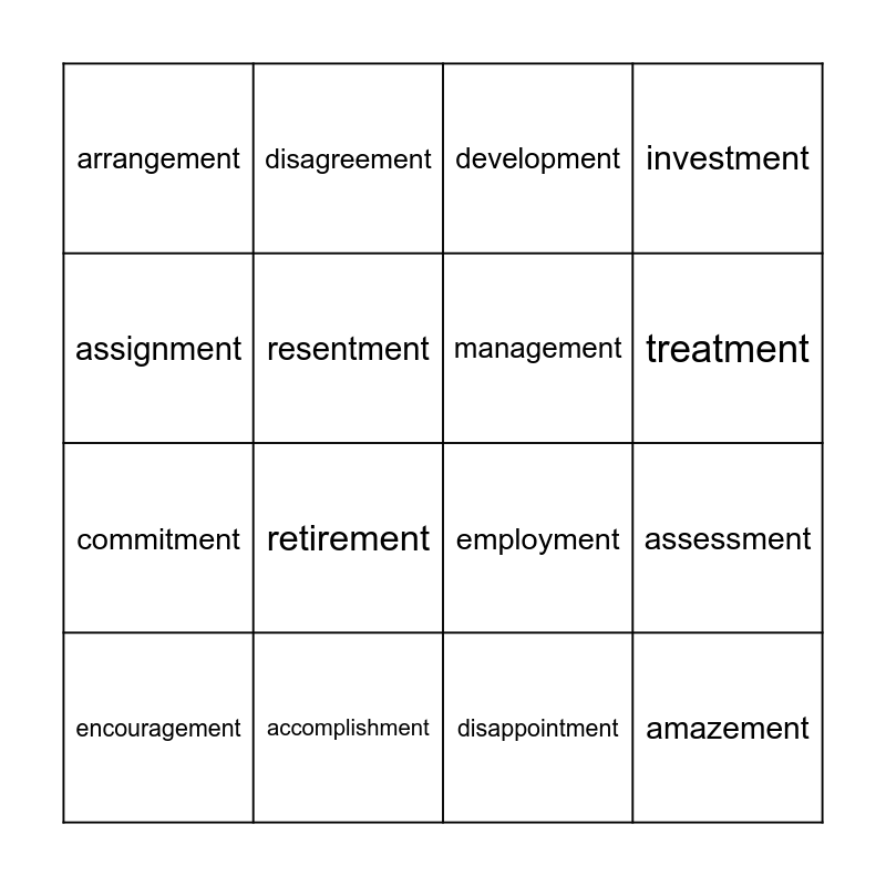 This bingo card has 16 words: accomplishment, assessment, development, arrangement, commitment, disagreement, employment, disappointment, assignment, resentment, encouragement, investment, retirement, treatment, management and amazement.