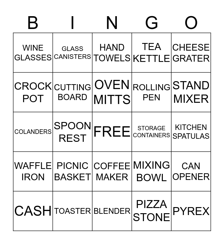 This bingo card has a free space and 24 words: PICNIC BASKET, TOASTER, OVEN MITTS, CASH, CHEESE GRATER, WINE GLASSES, CROCK POT, GLASS CANISTERS, STORAGE CONTAINERS, COFFEE MAKER, ROLLING PEN, COLANDERS, MIXING BOWL, CAN OPENER, CUTTING BOARD, PIZZA STONE, KITCHEN SPATULAS, HAND TOWELS, STAND MIXER, SPOON REST, PYREX, WAFFLE IRON, TEA KETTLE and BLENDER.
