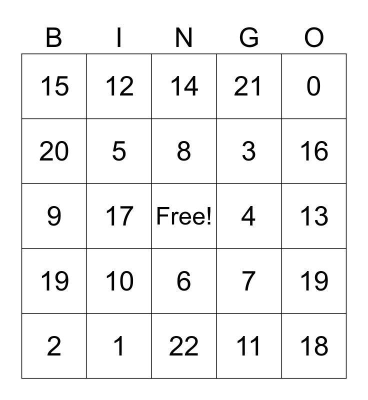 This bingo card has a free space and 24 words: 10, 1, 8, 2, 0, 15, 20, 12, 4, 6, 3, 9, 7, 19, 5, 11, 13, 14, 16, 17, 18, 19, 21 and 22.