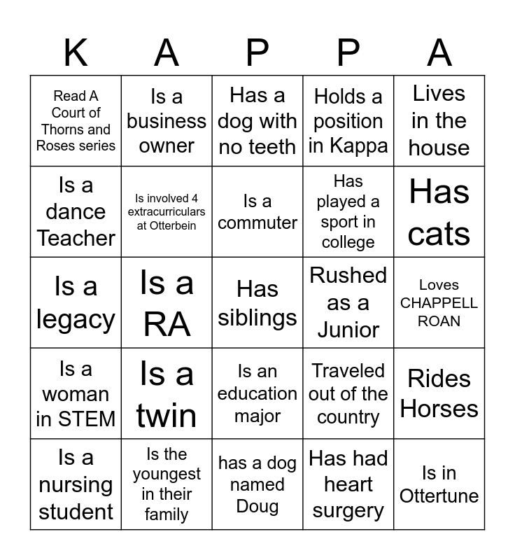 This bingo card has 25 words: Is a twin, has a dog named Doug, Is a commuter, Is a nursing student, Lives in the house, Read A Court of Thorns and Roses series, Is a dance Teacher, Is a business owner, Rushed as a Junior, Is an education major, Has played a sport in college, Is a legacy, Traveled out of the country, Rides Horses, Is involved 4 extracurriculars at Otterbein, Is in Ottertune, Loves CHAPPELL ROAN, Has a dog with no teeth, Has cats, Is a RA, Has siblings, Is the youngest in their family, Is a woman in STEM, Holds a position in Kappa and Has had heart surgery.