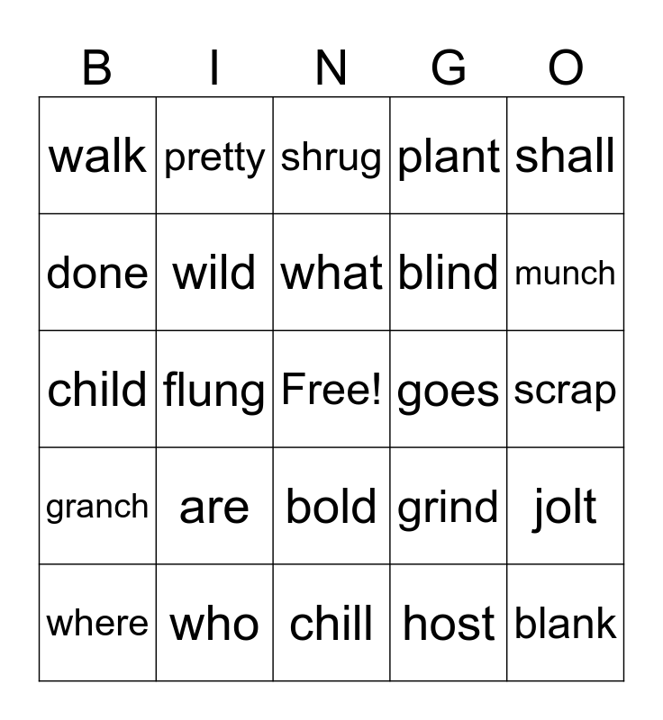 This bingo card has a free space and 24 words: are, who, what, where, shall, walk, done, pretty, goes, bold, blind, child, grind, jolt, wild, host, scrap, shrug, munch, flung, blank, granch, plant and chill.