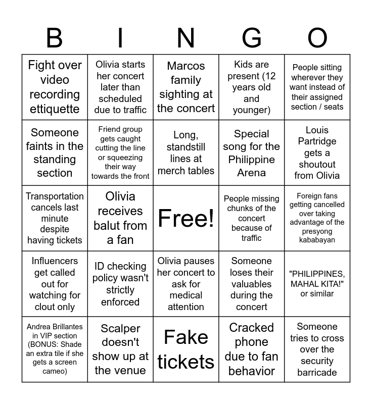 This bingo card has a free space and 24 words: ID checking policy wasn't strictly enforced, Scalper doesn't show up at the venue, Long, standstill lines at merch tables, Andrea Brillantes in VIP section (BONUS: Shade an extra tile if she gets a screen cameo), People sitting wherever they want instead of their assigned section / seats, Fight over video recording ettiquette, Someone faints in the standing section, Olivia starts her concert later than scheduled due to traffic, People missing chunks of the concert because of traffic, Olivia pauses her concert to ask for medical attention, Special song for the Philippine Arena, Transportation cancels last minute despite having tickets, Someone loses their valuables during the concert, "PHILIPPINES, MAHAL KITA!" or similar, Friend group gets caught cutting the line or squeezing their way towards the front, Cracked phone due to fan behavior, Foreign fans getting cancelled over taking advantage of the presyong kababayan, Marcos family sighting at the concert, Louis Partridge gets a shoutout from Olivia, Olivia receives balut from a fan, Someone tries to cross over the security barricade, Influencers get called out for watching for clout only, Kids are present (12 years old and younger) and Fake tickets.
