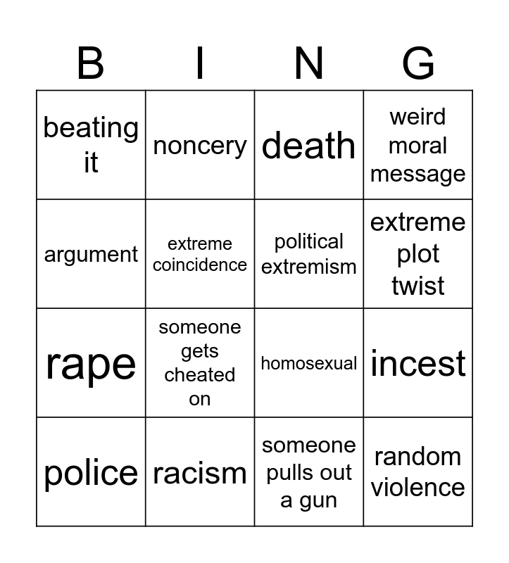 This bingo card has 16 words: racism, incest, death, beating it, rape, noncery, homosexual, someone pulls out a gun, argument, extreme coincidence, police, weird moral message, someone gets cheated on, extreme plot twist, political extremism and random violence.