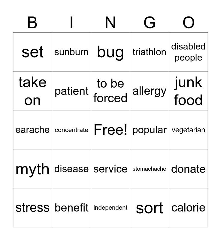 This bingo card has a free space and 83 words: belong to, benefit, bug, cardboard, dollhouse, gardening, glue, horse riding, insect, jogging, making models, maturity, patient, popular, responsibility, set, stress, take on, unusual, valuable, yoga, allergy, calorie, compound, concentrate, conjunction, coordinate, cough, depression, diet, disease, essential, expert, earache, flu, headache, independent, itchy, junk food, myth, obesity, pay attention, put on weight, sickness, spot, stay in shape, sunburn, sunburnt, sore throat, spots, stomachache, triathlon, vegetarian, temperature, tired, toothache, weight, weak, benefit, blanket, charitable, clean up, community service, disabled people, homeless people, donate, elderly people, graffiti, mentor, make a difference, nursing home, mural, shelter, service, sort, street children, non-profit organisation, to be forced, traffic jam, tutor, volunteer, interview and organization.