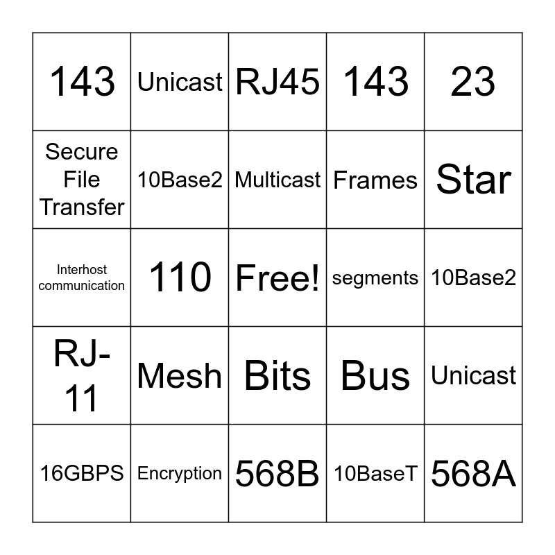 This bingo card has a free space and 24 words: 16GBPS, Mesh, Multicast, 10BaseT, 23, 143, Unicast, RJ45, segments, 10Base2, Interhost communication, 10Base2, Bus, Unicast, Secure File Transfer, Encryption, 568B, 143, Star, RJ-11, 110, Bits, Frames and 568A.