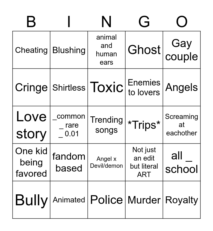 This bingo card has a free space and 24 words: fandom based, Animated, Toxic, Bully, Gay couple, Cheating, Cringe, Blushing, *Trips*, Angel x Devil/demon, Enemies to lovers, Love story, Not just an edit but literal ART, all _ school, Shirtless, Murder, Screaming at eachother, animal and human ears, Angels, _common _ rare _ 0.01, Royalty, One kid being favored, Ghost and Police.