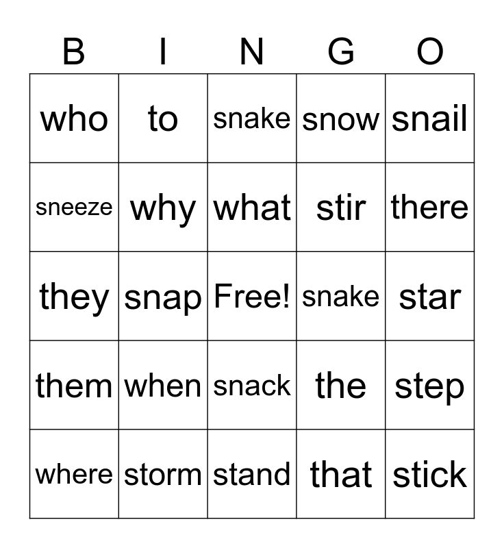 This bingo card has a free space and 24 words: when, storm, what, where, snail, who, sneeze, to, snake, snack, stir, they, the, step, why, that, star, snake, there, snap, stick, them, snow and stand.