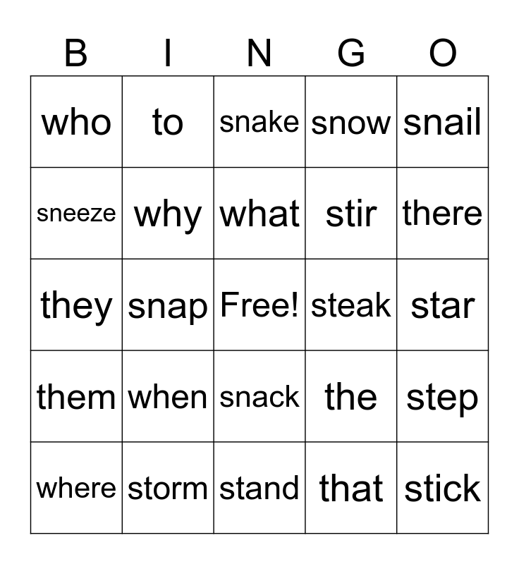 This bingo card has a free space and 24 words: when, storm, what, where, snail, who, sneeze, to, steak, snack, stir, they, the, step, why, that, star, snake, there, snap, stick, them, snow and stand.